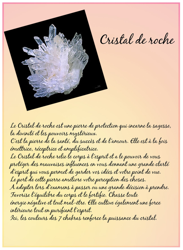 Le Cristal de roche est une pierre de protection qui incarne la sagesse, la divinité et les pouvoirs mystérieux. C’est la pierre de la santé, du succès et de l’amour.