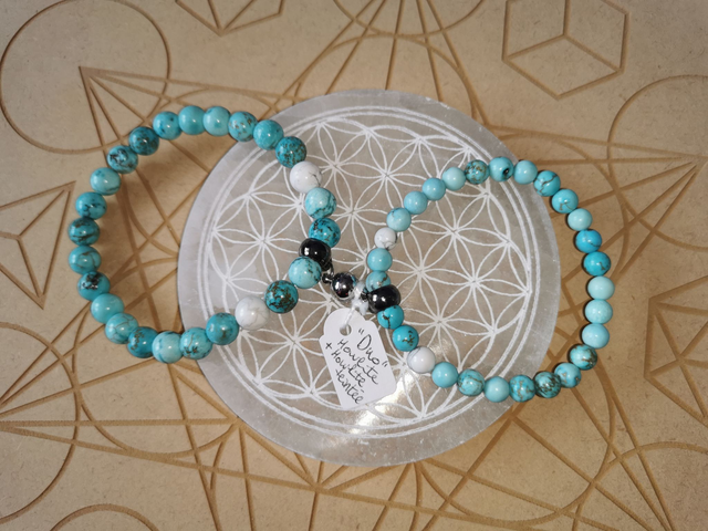 Bracelet duo mixte en pierre naturelle Howlite et Howlite teintée turquoise.
